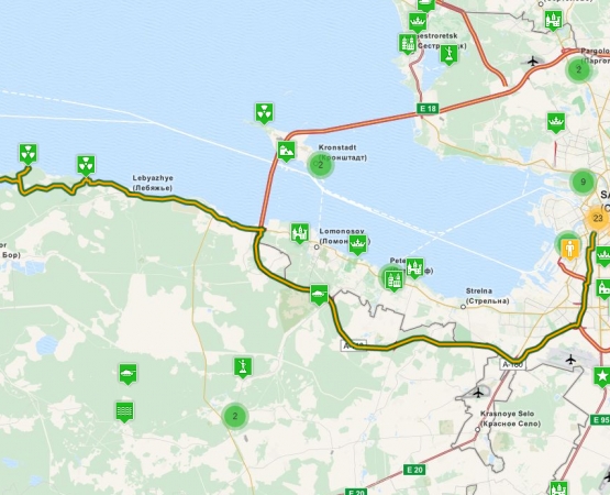 Старт от музея Лего, т.к. от него мы ещё не начинали наши поездки. И сразу большой перегон - почти 100 км на запад, к форту Красная горка. Важно помнить, что по пути следования вам встретится КПП и там могут попросить показать паспорт! Следующая точка - батарея Серая лошадь, а ещё дальше бухта Батарейная и её пляж. При желании можете полюбоваться на Шепелёвский маяк - он тут совсем рядом.